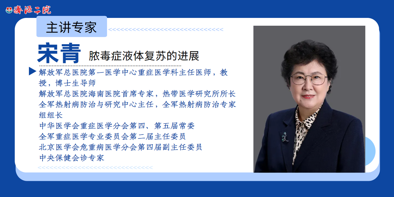 由解放军总医院第一医学中心重症医学科主任医师,教授、博士生导师,中华医学会重症医学分会第四、五届常委,全军重症医学专业委员会第二届主任委员宋青主讲。