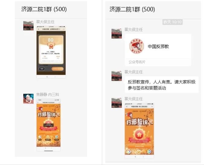 我院通过在微信工作群转发公众号“中国反邪教”,呼吁广大职工积极参与本次活动,并通过其“反邪专区”推文,全方位多角度地让职工深入了解邪教的本质、基本特征和表现形式,邪教对家庭和社会的危害、邪教与宗教的区别以及如何抵制邪教等相关知识,提高职工对邪教危害的知晓率,切实增强自觉抵御邪教侵蚀的能力,共同维护国家安全和社会稳定。