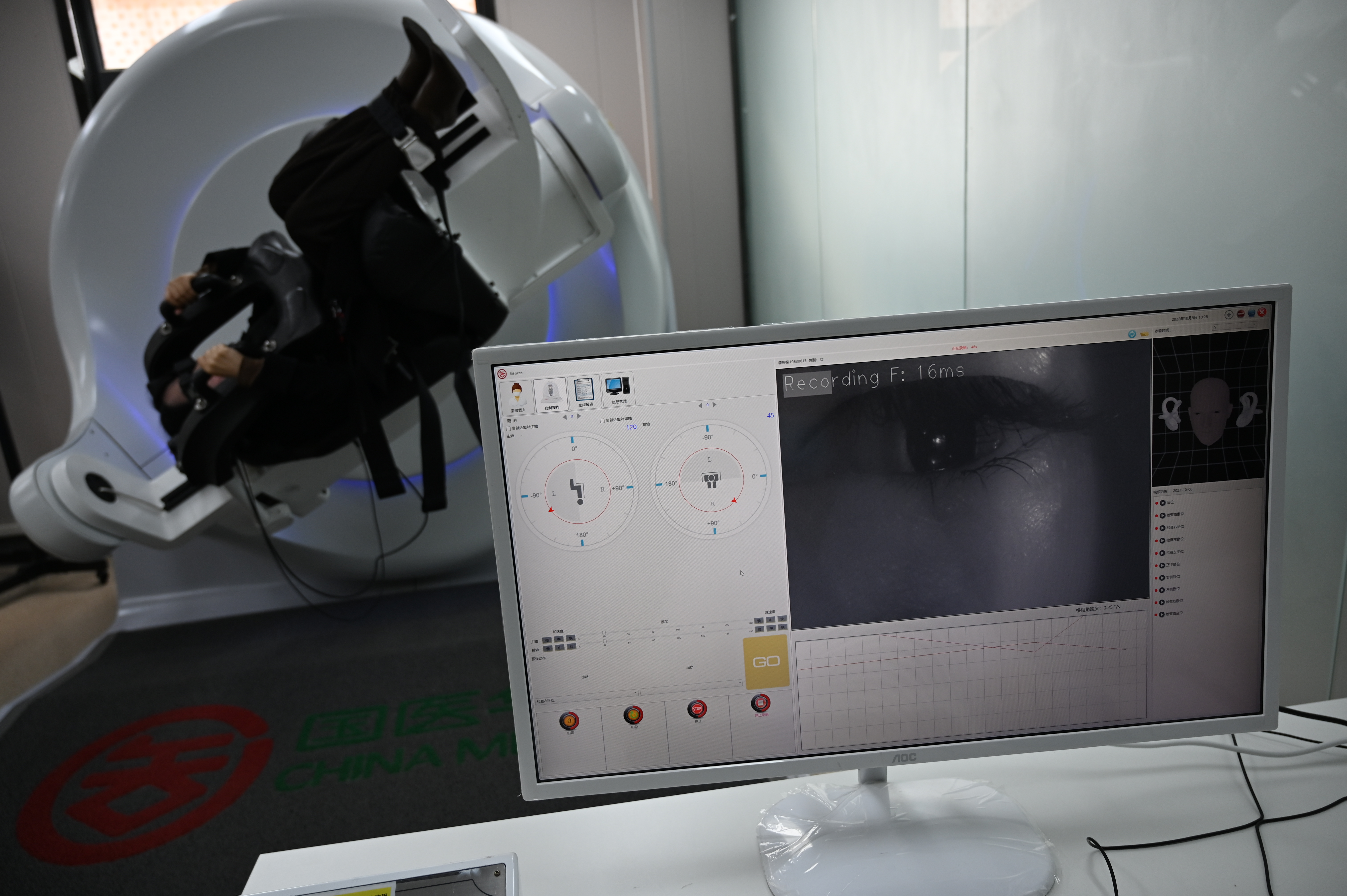 来到眩晕门诊,一进门,他就看到医生李小玲在为患者诊治。只见她边操作电脑,边温柔安慰患者。患者倒悬在机器中,全身固定,规律旋转,非常配合医生做检查。