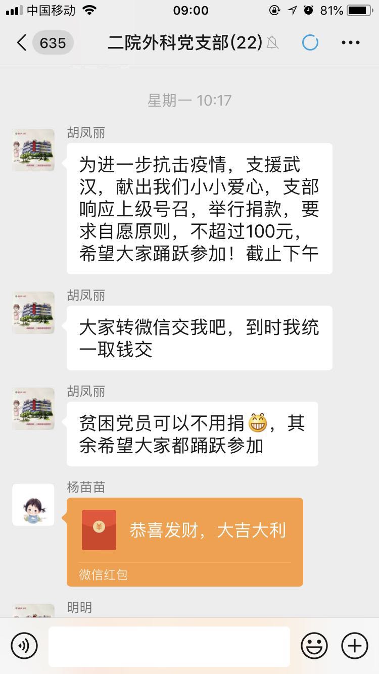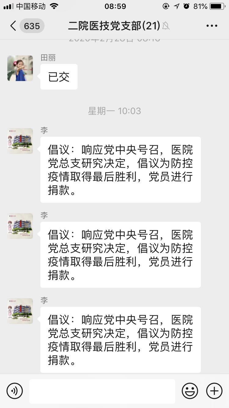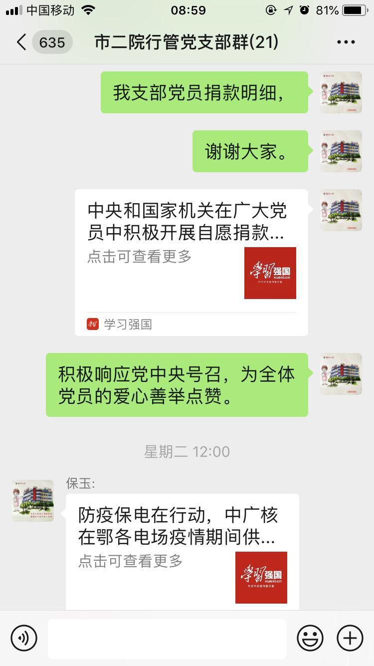为积极响应党中央号召,支持新冠肺炎疫情防控,医院党总支研究决定,本着尊重党员意愿,坚持自觉自愿的原则,倡议共产党员为防控疫情取得最后胜利进行捐款。自3月3日倡议发出后,各支部书记率先垂范、慷慨解囊,党员们积极响应、踊跃捐款,短短两天时间,共筹集爱心捐款5900元,特别是我院老干部党支部的孔祥来、李和平、尹爱霞、冯冬青、卢万桢、高国军等退休老党员,退休后仍然关注与支持医院疫情防控工作,牵挂一线的抗疫工作人员,及时伸出援助之手,这份不忘初心的热忱,他们的无私情怀和奉献精神深深值得我们每位党员学习。总支党务干部已经完成党员捐款的登记工作,并于3月5日将捐款全部上交财务科,建立专账保存,捐款用途按照上级党组织通知执行。