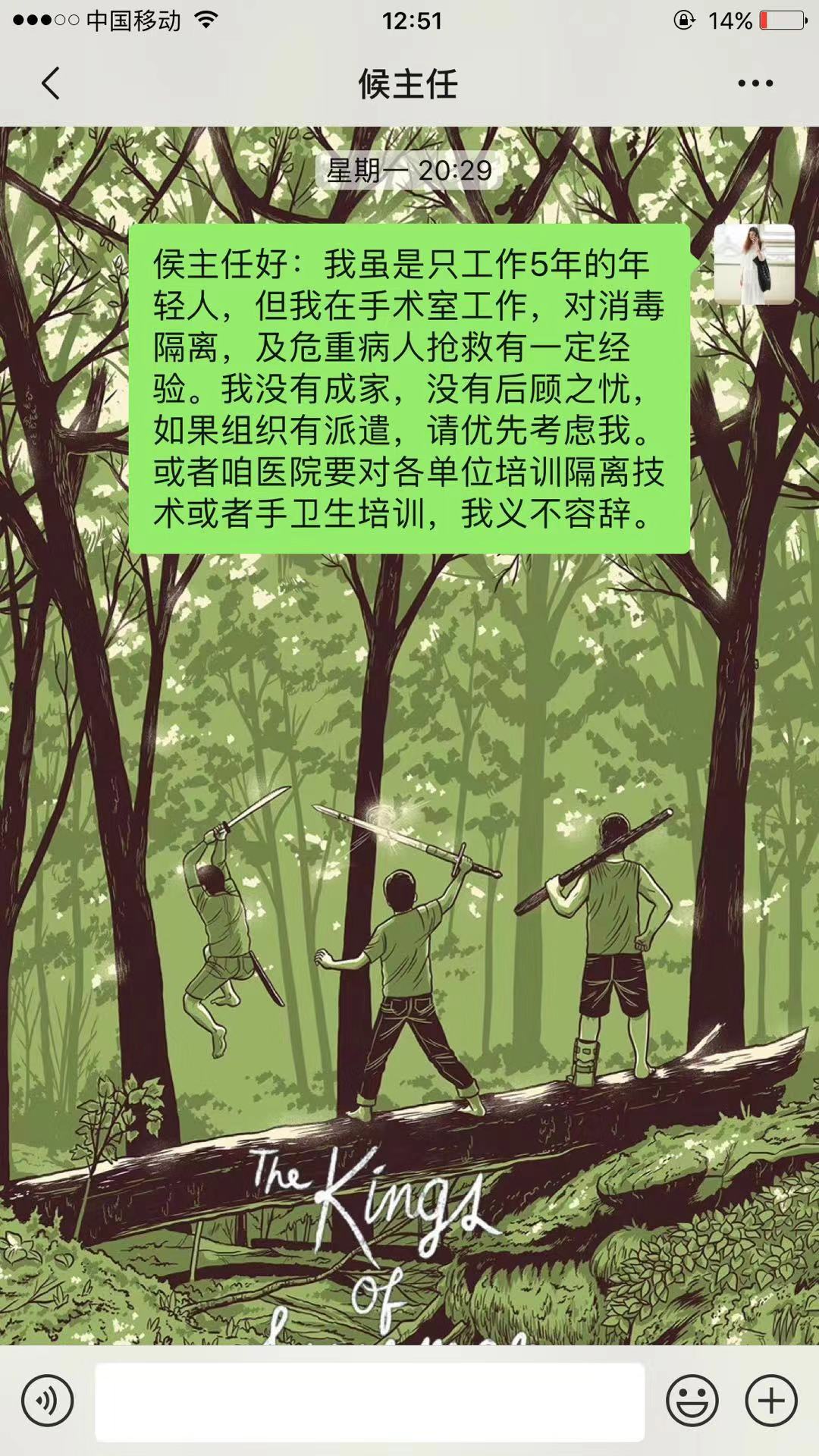 “侯主任好:我虽是只工作5年的年轻人,但我在手术室工作,对消毒隔离及危重病人抢救有一定经验。我没有成家,没有后顾之忧,如果医院有派遣,请优先考虑我。或者咱医院要对各单位培训隔离技术或者手卫生培训,我义不容辞。”商亚辉一字一句写下自己的请求。