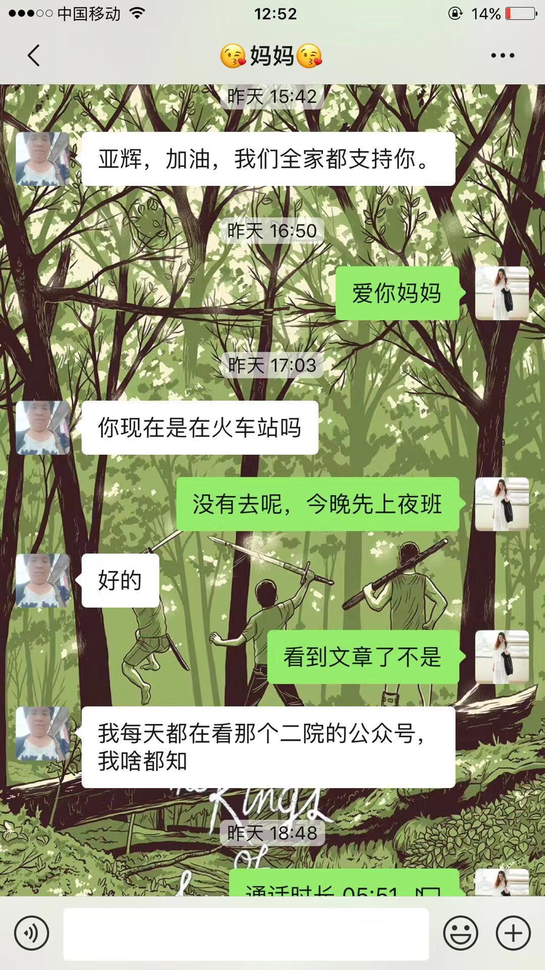 说出请求以后,因为不想让家人担心,她并没有把这个消息告诉他们。直到那天看到妈妈给自己发的微信:亚辉,加油,我们全家都支持你。原来妈妈一直关注着济源二院的微信公众号,特别是看到《济源火车站成为重要疫情防控排查点,我们这样做!》一文,知道医生护士们都在主动请战到一线抗击疫情。以她对女儿的了解,女儿肯定会主动请战,所以她给女儿发了一条微信,为她加油鼓劲。不仅如此,爸爸、弟弟、妹妹一家人都全票支持她奔赴抗疫战场。
