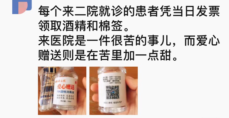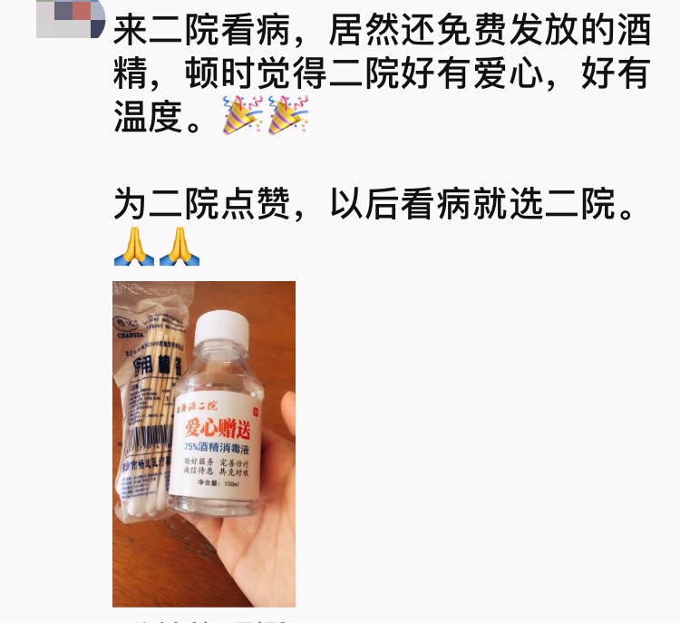 “来二院看病,居然还免费发放酒精,顿时觉得二院好有爱心,好有温暖,为二院点赞,以后看病就选二院。”