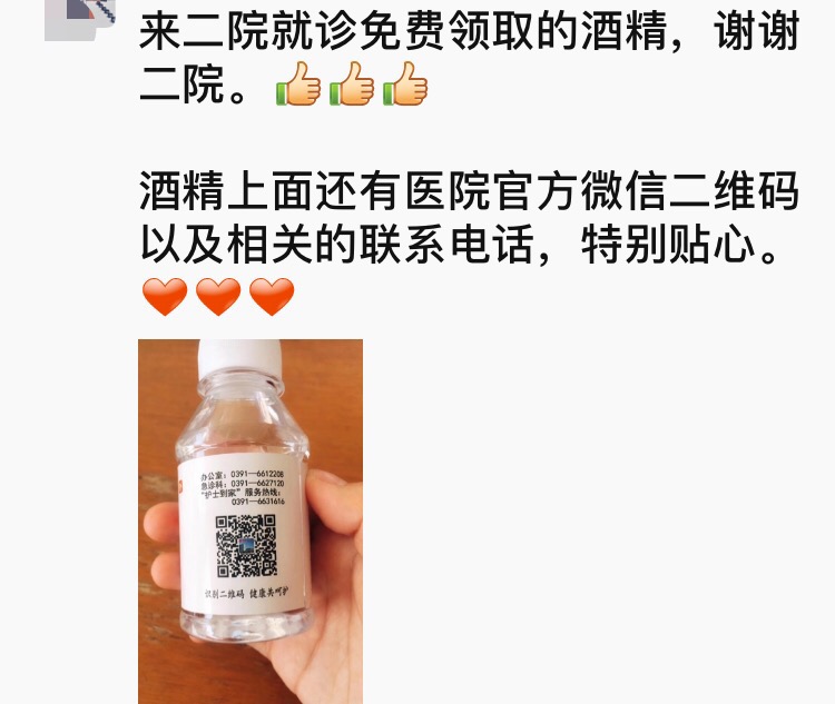 “来二院就诊免费领取的酒精,谢谢二院。酒精上面还有医院官方微信二维码以及相关的联系电话,特别贴心。”