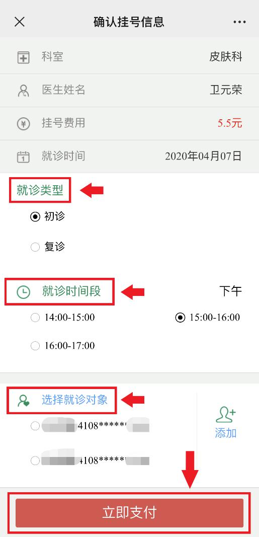 第二步:选择预约科室→预约医生→选择时间段→立即支付。