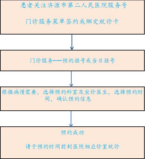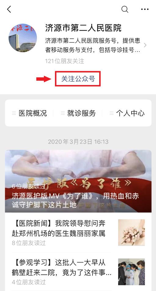 第一步:在微信公众号里添加“济源市第二人民医院”并关注,点击【就诊服务】菜单→【门诊服务】→【预约挂号】。