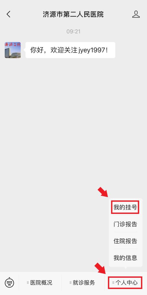 操作流程:在微信公众号里添加“济源市第二人民医院”并关注,点击【个人中心】菜单→【我的挂号】。