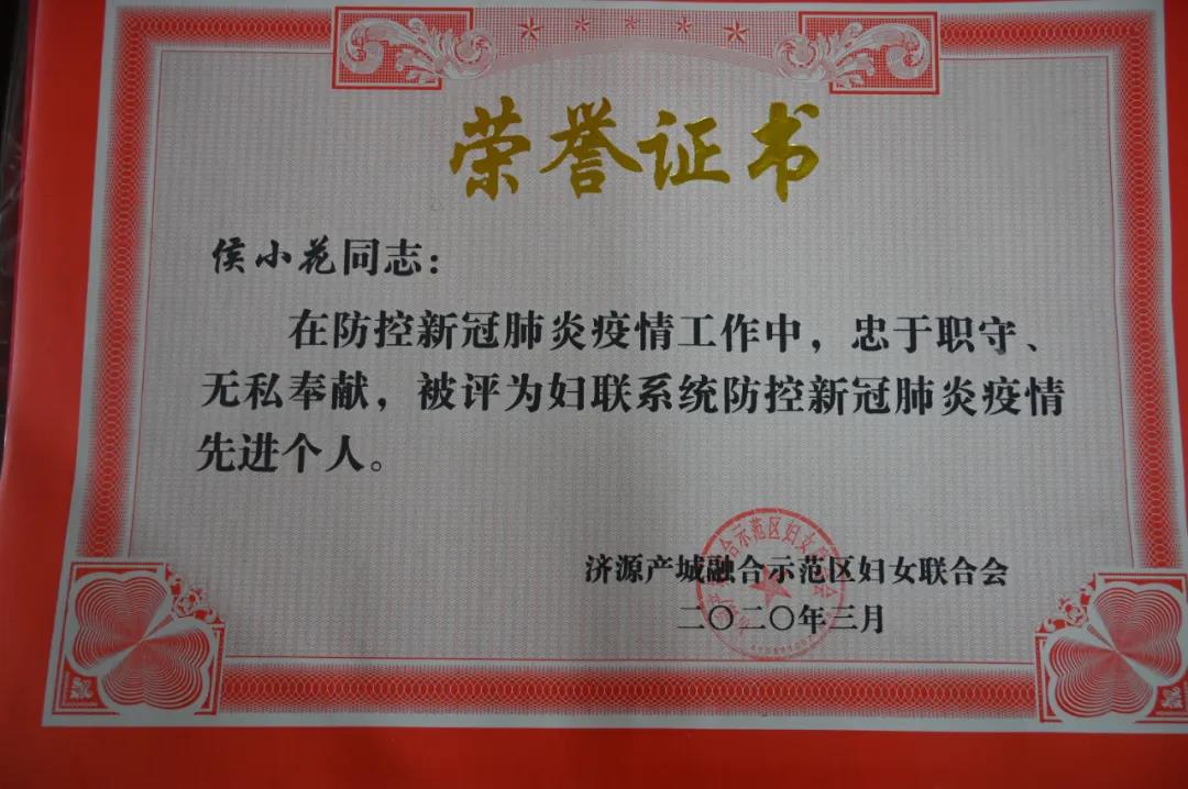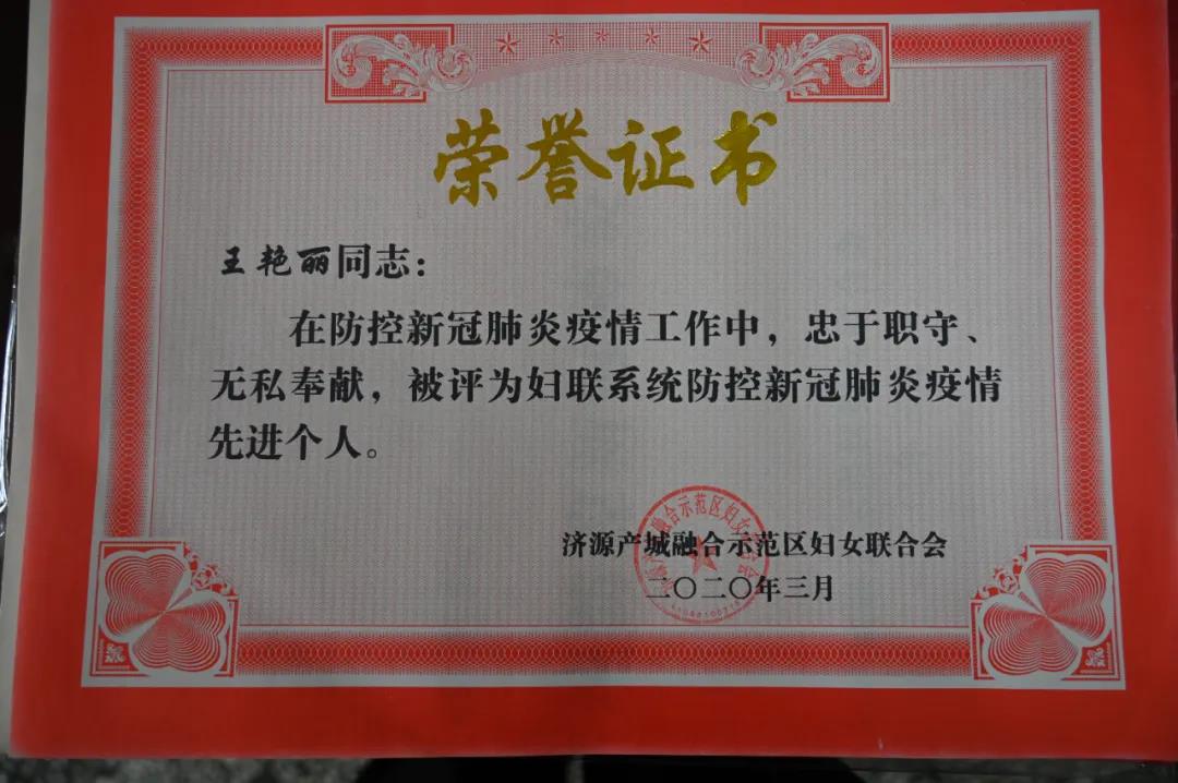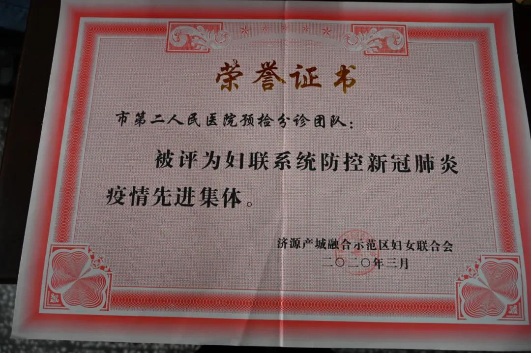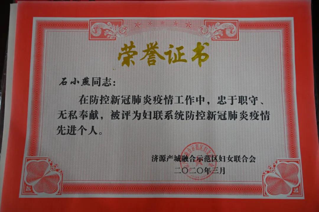 济源二院预检分诊团队,被评为济源产城融合示范区妇女联合会防控新冠肺炎疫情先进集体。济源二院心内科副主任石小燕、护理部主任侯小花、门诊部护士长王艳丽在防控新冠肺炎疫情工作中,忠于职守、无私奉献,被评为妇联系统防控新冠肺炎疫情先进个人。