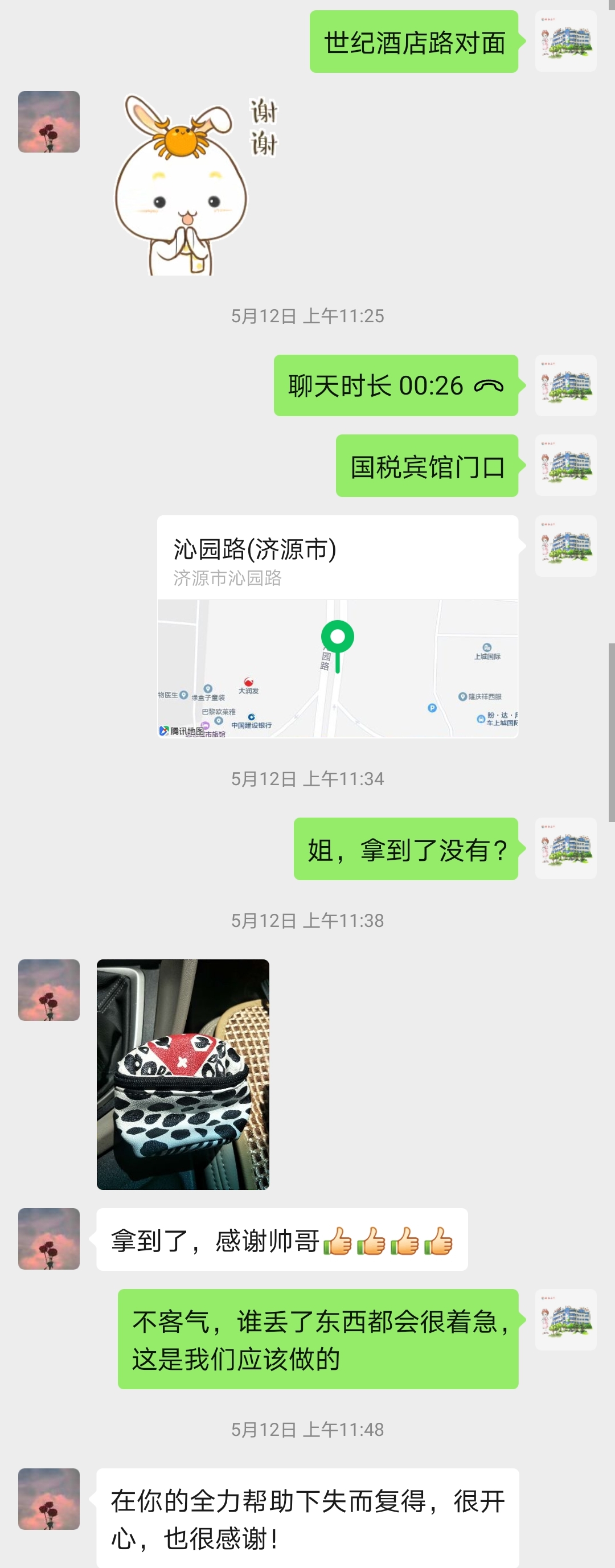 几经周折,终于拿到了老人的联系方式。约定好世纪酒店门口拿,老人临时有事换成了国税宾馆门口,郭刚怕张女士不知道在哪,贴心地给张女士发了定位。九点半到将近十二点,长达两个小时的寻找,钱包失而复得,张女士很是激动,千言万语也表达不了张女士的感激之情。