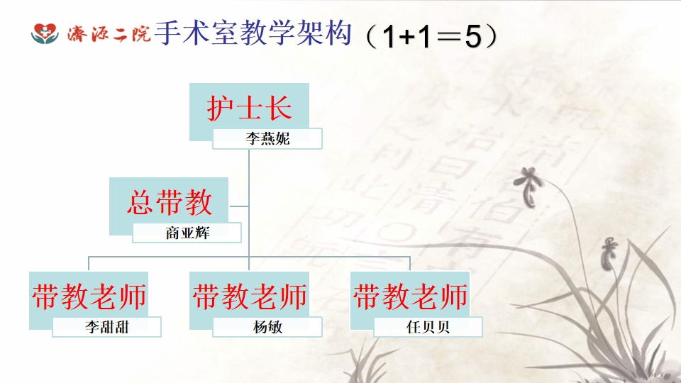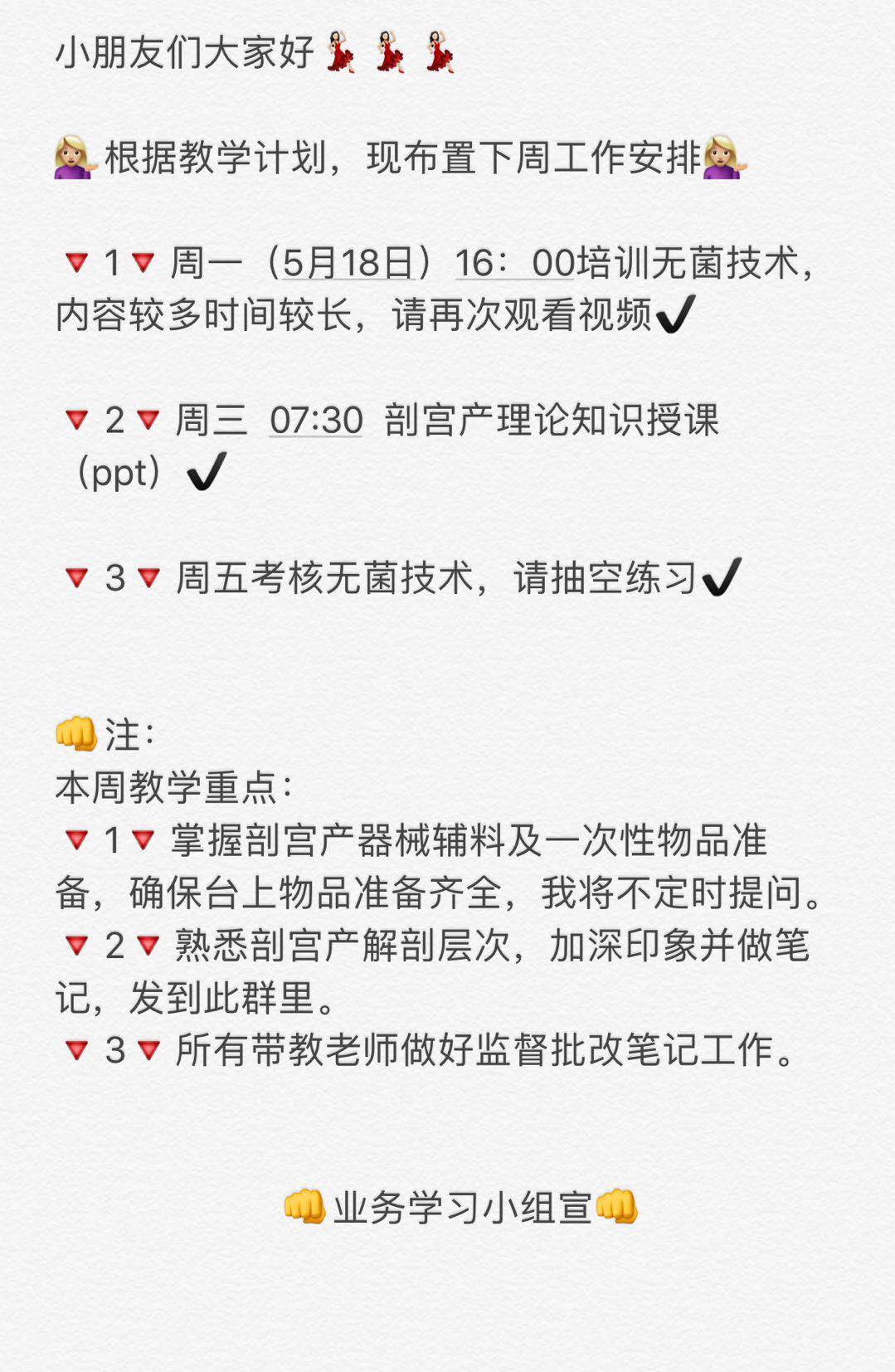我是那么那么感激我的护士长李燕妮,她给我最好的平台,最好的鼓励。2018年5月,在我组建团队初给予我最大的支持。我们需要先制定培训的内容,针对新入职护士及科室内部护士,有不一样的培训计划。2018年6月到11月,带教组对科室所有设备仪器进行新一轮培训,并在每一个仪器粘贴操作流程标准,对不常用设备加强培训,做到人人会安装使用,拍摄视频制作图谱。进修归来人员对科室内部进行理论实践授课,考核人人过关。根据教学计划一步一步引领新入职护士,使其在入科第一时间养成规范操作的习惯。根据教学安排,我每周还会做一份周计划表,具体到哪一天哪一点,要求同学们根据今天所跟手术,并向我做出笔记反馈。并在出科时进行ppt汇报。已毕业学员4批次。