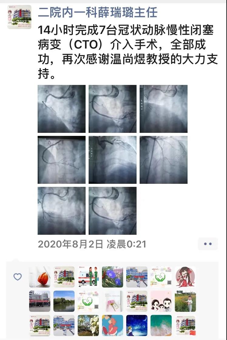 8月2日凌晨零点21分,济源二院心内科主任薛瑞璐发了一条这样的朋友圈:“14小时完成7台冠状动脉慢性闭塞病变(CTO)介入手术,全部成功,再次感谢温尚煜教授的大力支持。”