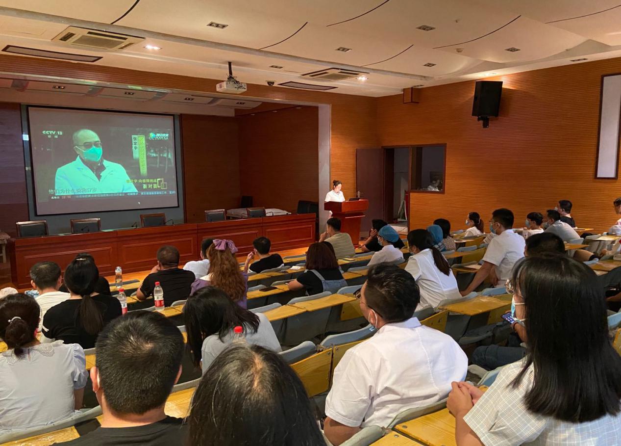 在唱歌曲环节,全体人员齐声歌唱《爱的奉献》,活跃了现场气氛。在学模范环节,观看了武汉市金银潭医院院长——张定宇同志的事迹短片,主持人为大家讲述了他的先进事迹。