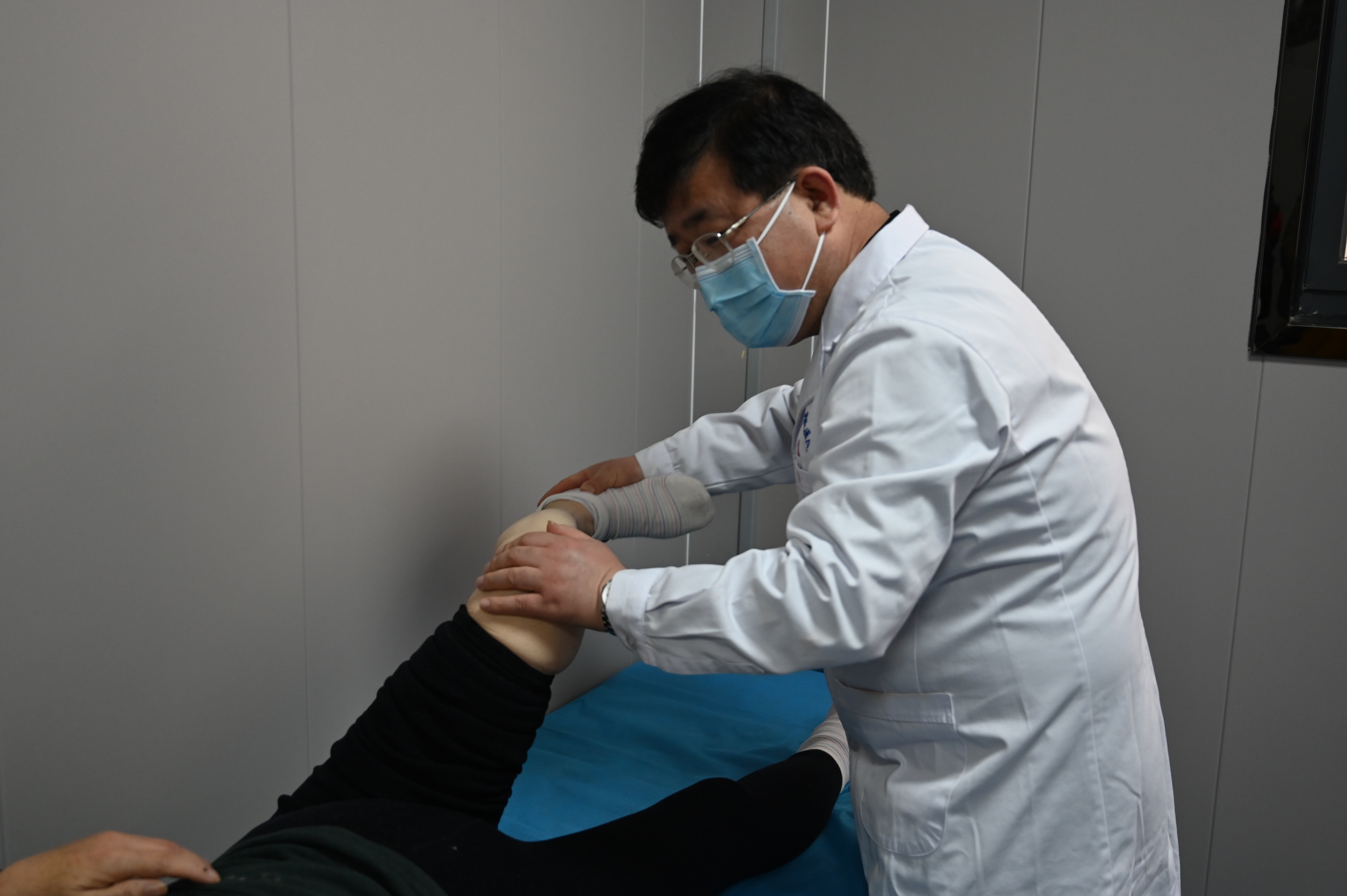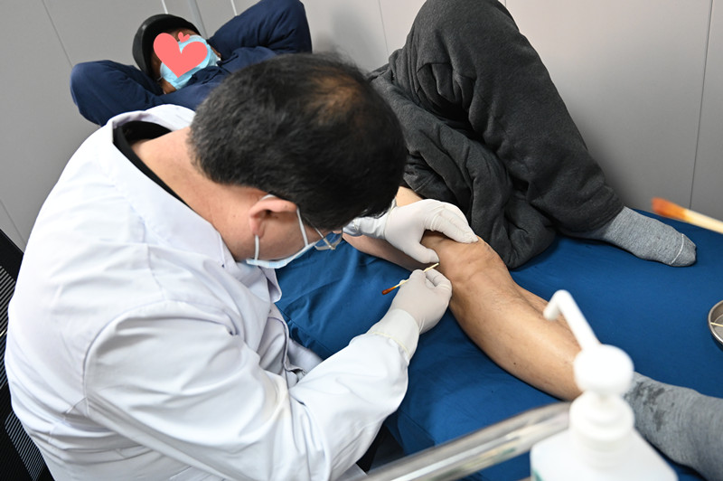 李大爷,患的是膝关节骨性关节炎。靳晓东教授对患者病情进行详细评估,制定康复方案。现场实操冲击波治疗仪给患者治疗。