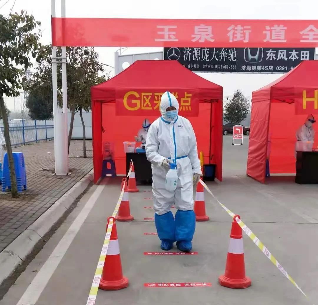 演练开始后,首先组织好来检人员,佩戴口罩,手持身份证,按照一米线提示有序排队,进行身份验证、体温检测;派出所干警维持所有来检人员的秩序;玉泉街道办事处工作人员负责信息登记、询问工作;济源二院、玉泉卫生院医护工作者负责核酸采样、标本转运、医疗废物处理、终末消杀等工作。整个过程中,志愿者负责所有协调安排工作,做好服务。