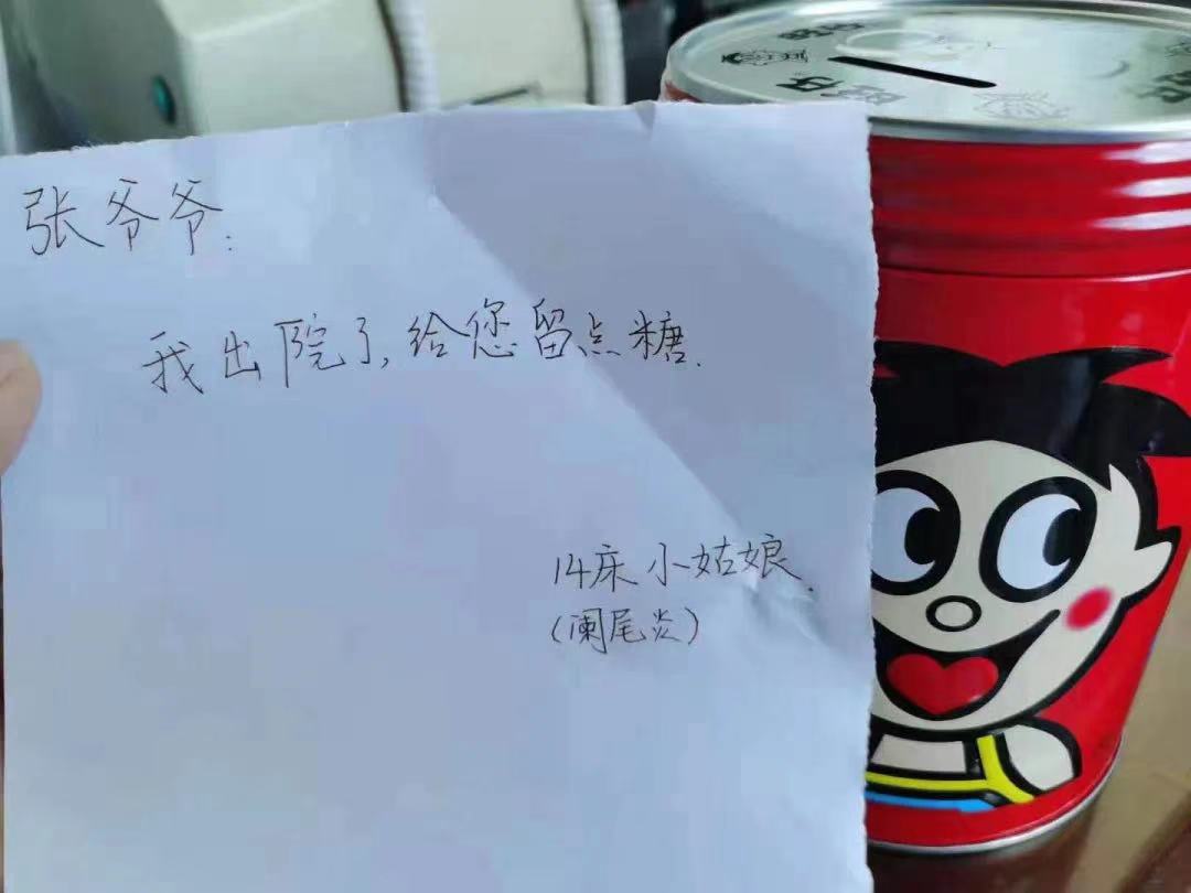 “张爷爷:我出院了,给您留点糖。14床小姑娘(阑尾炎)。”简简单单一句话,一罐旺仔牛奶糖,一朵淡黄色的鲜花,代表着她所有的心意。