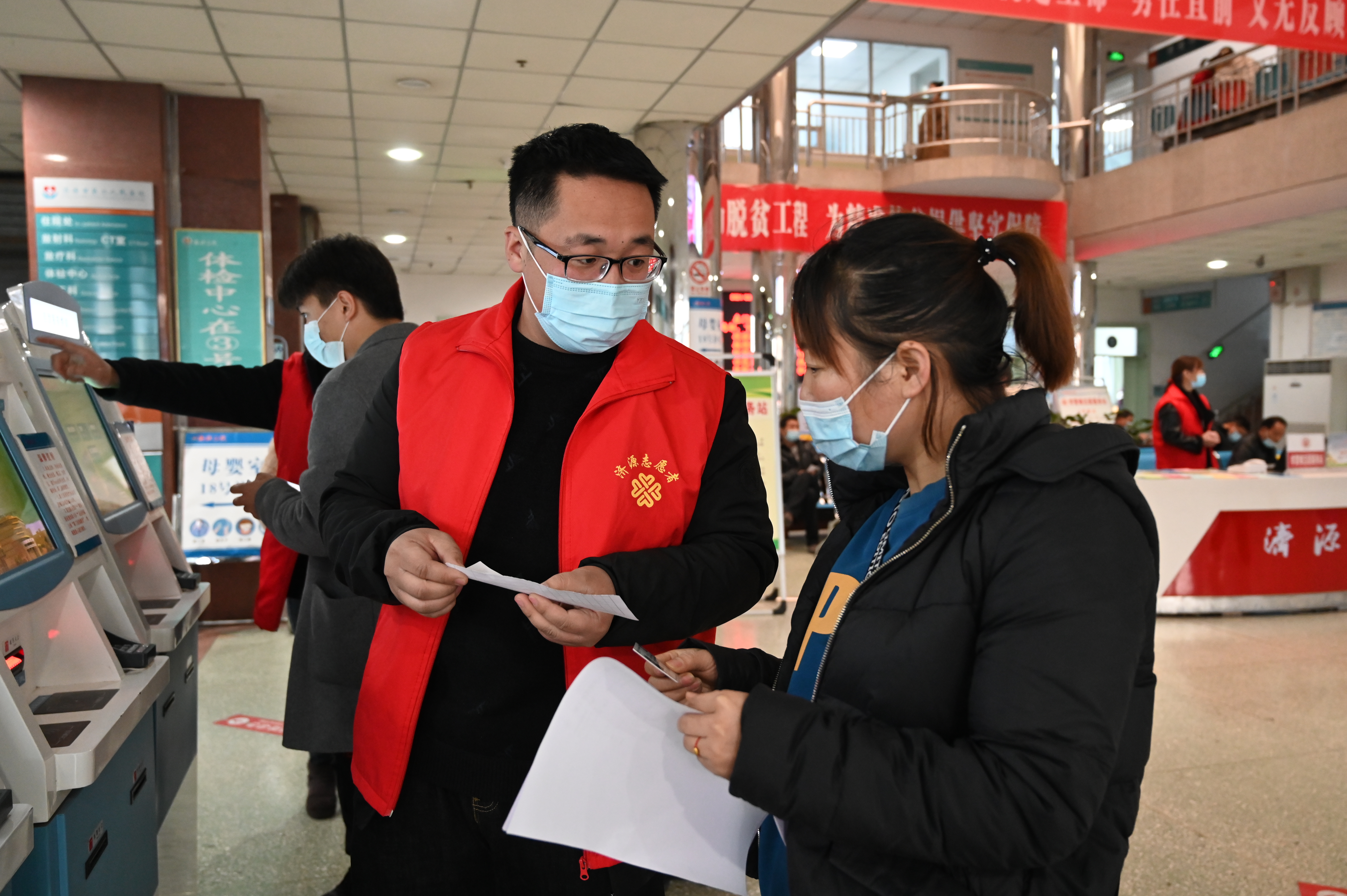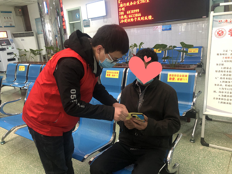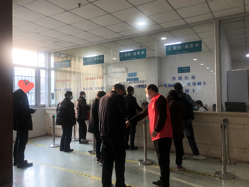 志愿者及时对门诊收费处、药房、电梯口等人群易集聚处进行疏导,指挥排队,维持就诊秩序,保持一米以上安全距离,保证大厅内井然有序。