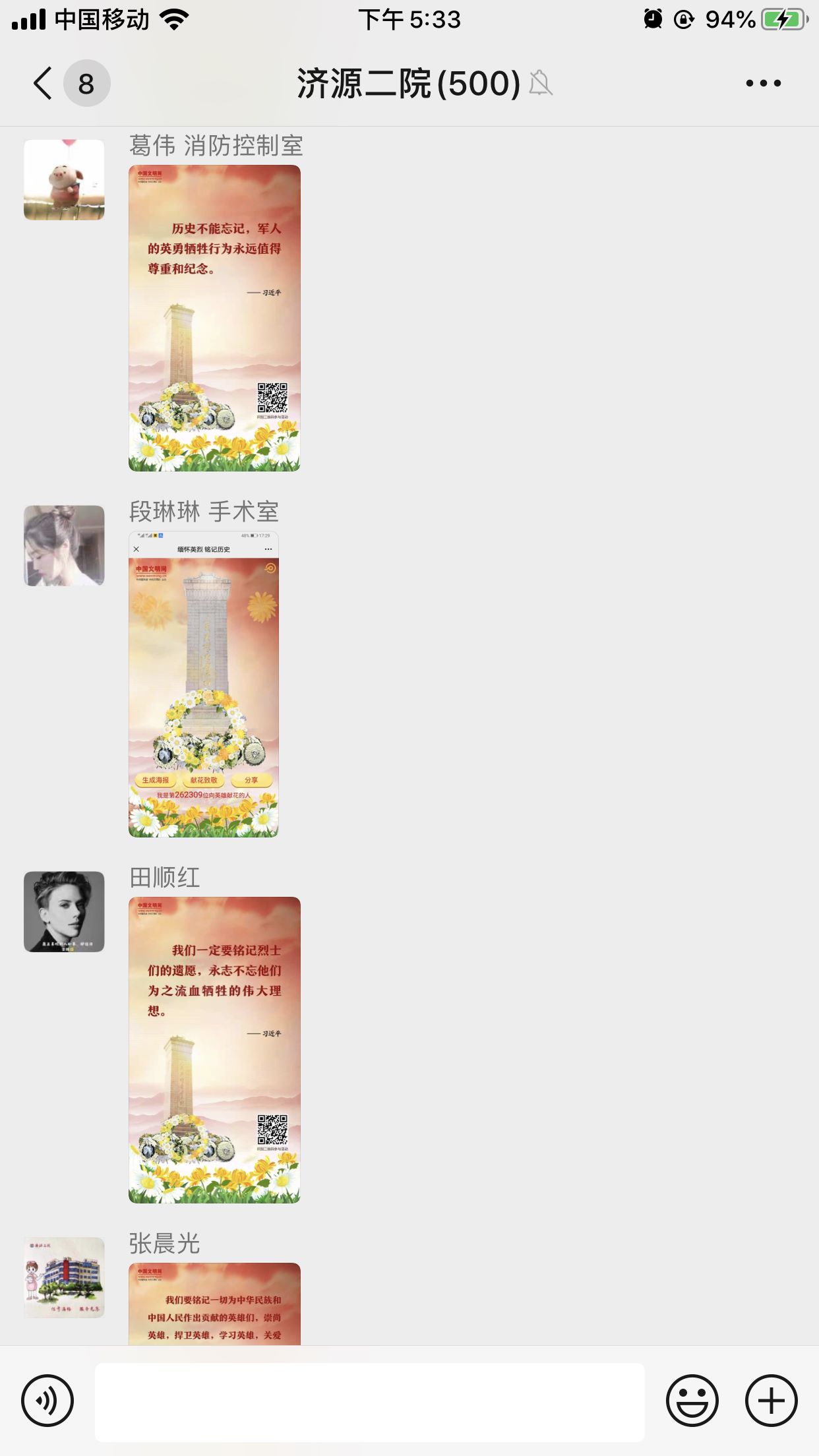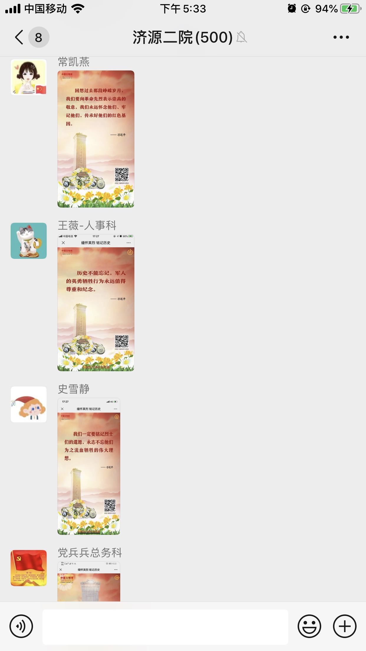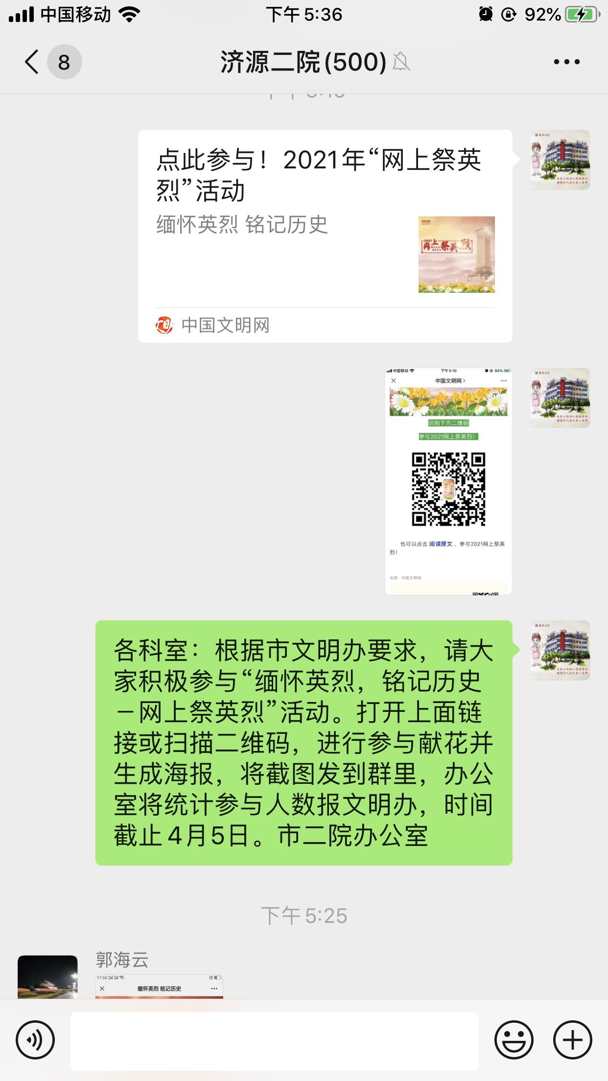 会后,全院职工纷纷参与”向英雄烈士们献花”网上祭英烈活动,向一切为中华民族和中国人民作出贡献的英雄先烈们致敬!让全社会形成弘扬革命传统,崇尚英雄,继承遗志、砥砺前行的强大精神力量。并表示将积极践行绿色祭祀理念,进行文明扫墓,积极发挥自身力量,主动向周边人传导环保意识,自觉文明低碳祭扫,为保护生态环境、助力乡村振兴作出新的贡献。