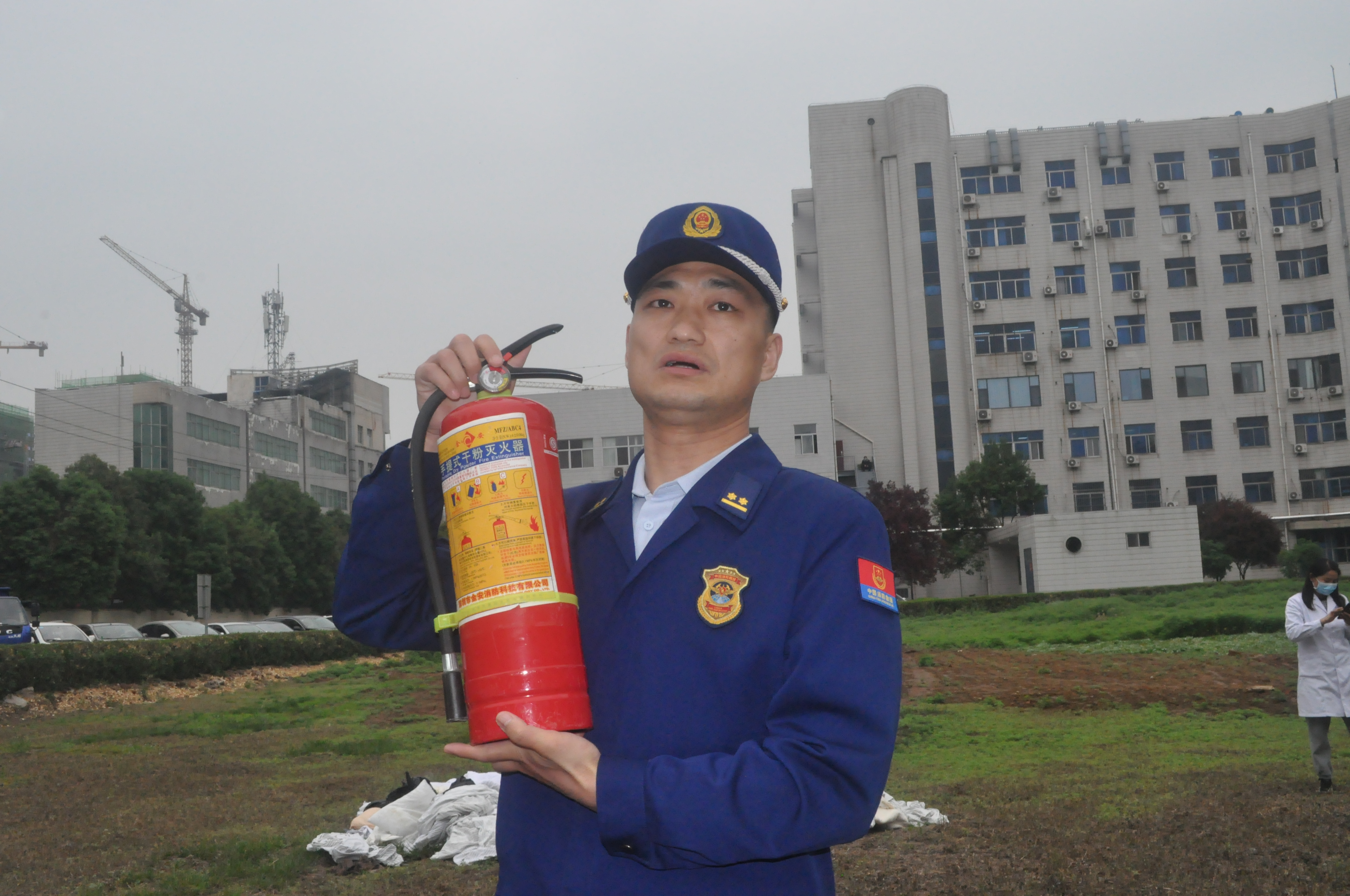 实践出真知,专题讲座结束后,朱教官带领大家进行了消防灭火的实战演练。他先向大家详细讲解了灭火器的正确使用方法及注意事项。