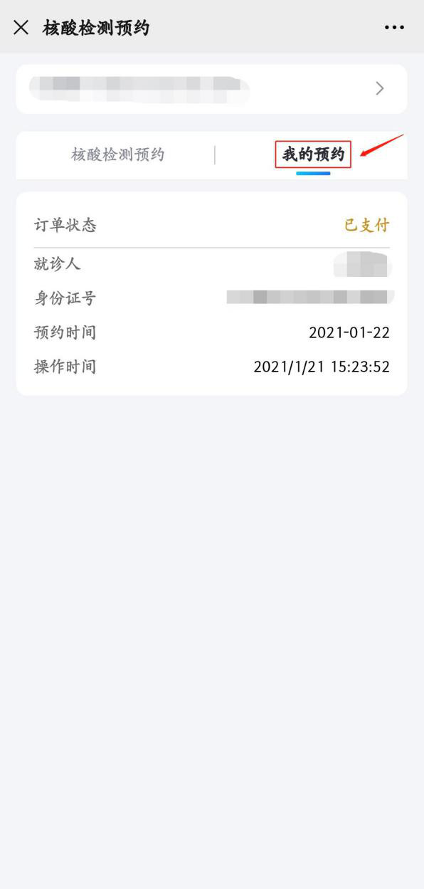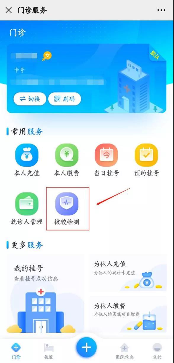 实名制就诊:我院严格执行实名制就诊,首次微信预约新冠肺炎核酸检测需添加就诊人,进行实名认证或绑定就诊卡,无卡患者填写实名信息,系统自动生成电子就诊码。