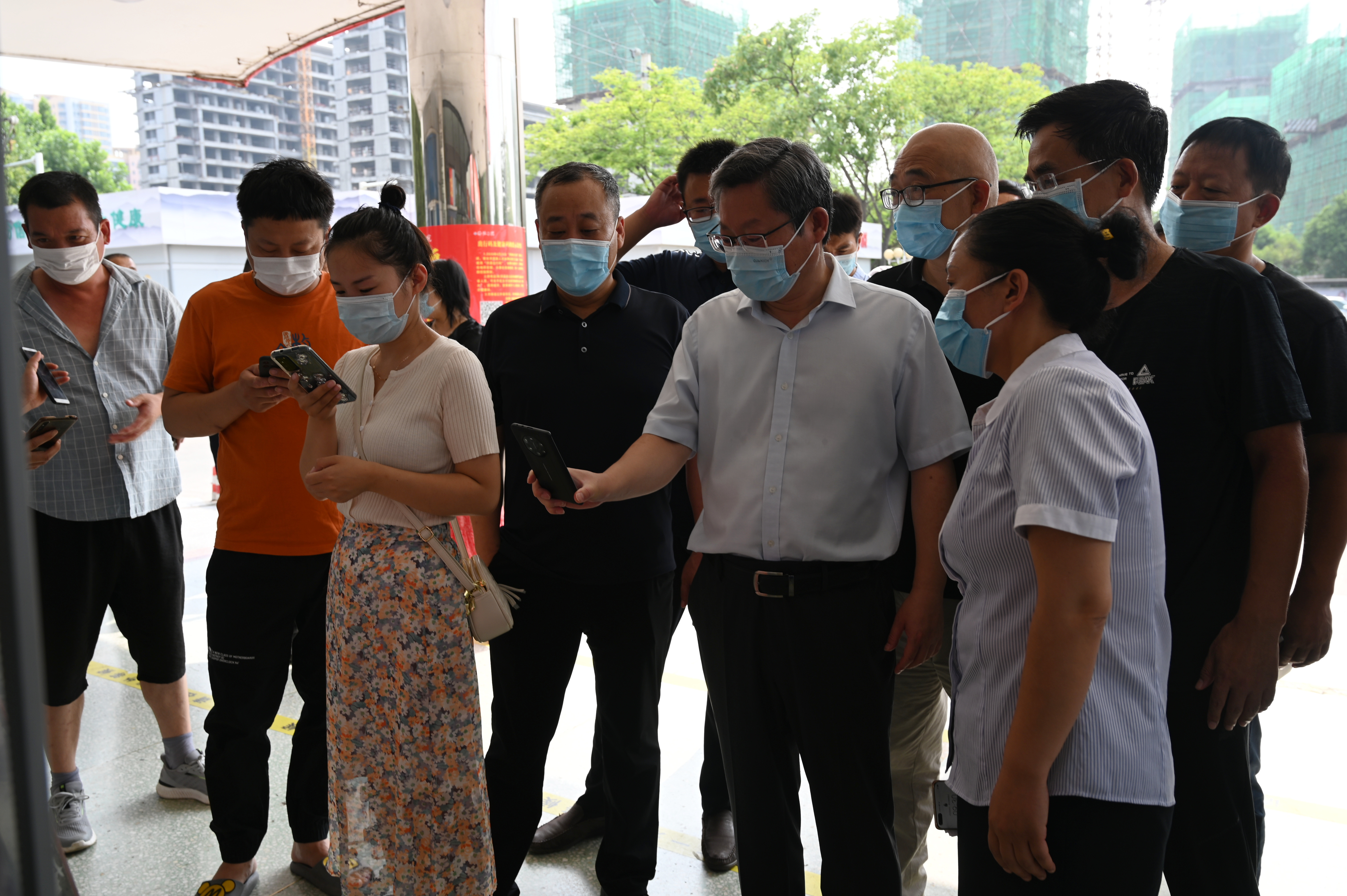 谭江一行参观了发热门诊,对成人发热门诊及候诊区、儿童发热门诊及候诊区、医护人员通道等场所进行现场查看。又来到预检分诊处,这是患者入院治疗第一道关口。副书记任海燕讲解预检分诊处对来院人员测量体温、询问流行病学史,按照流程严格筛查,避免出现院内交叉感染。谭江拿出自己的手机,当场扫描济源出行通用码,并仔细询问了患者就诊流程。