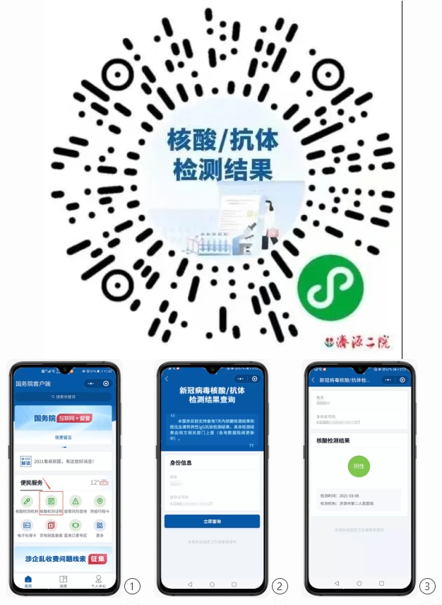 一、长按识别以下二维码跳转至国务院客户端小程序 → 点击“核酸检测证明” → 输入姓名及身份证号码,可查询核酸检测结果。