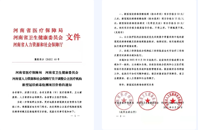 由《河南省医疗保障局、河南省卫生健康委员会、河南省人力资源和社会保障厅关于调整公立医院机构新型冠状病毒检测项目价格的通知 》,为进一步降低群众负担,更好地服务新冠肺炎疫情常态化防控工作,决定调整公立医疗机构新型冠状病毒核酸及抗体检测项目价格。