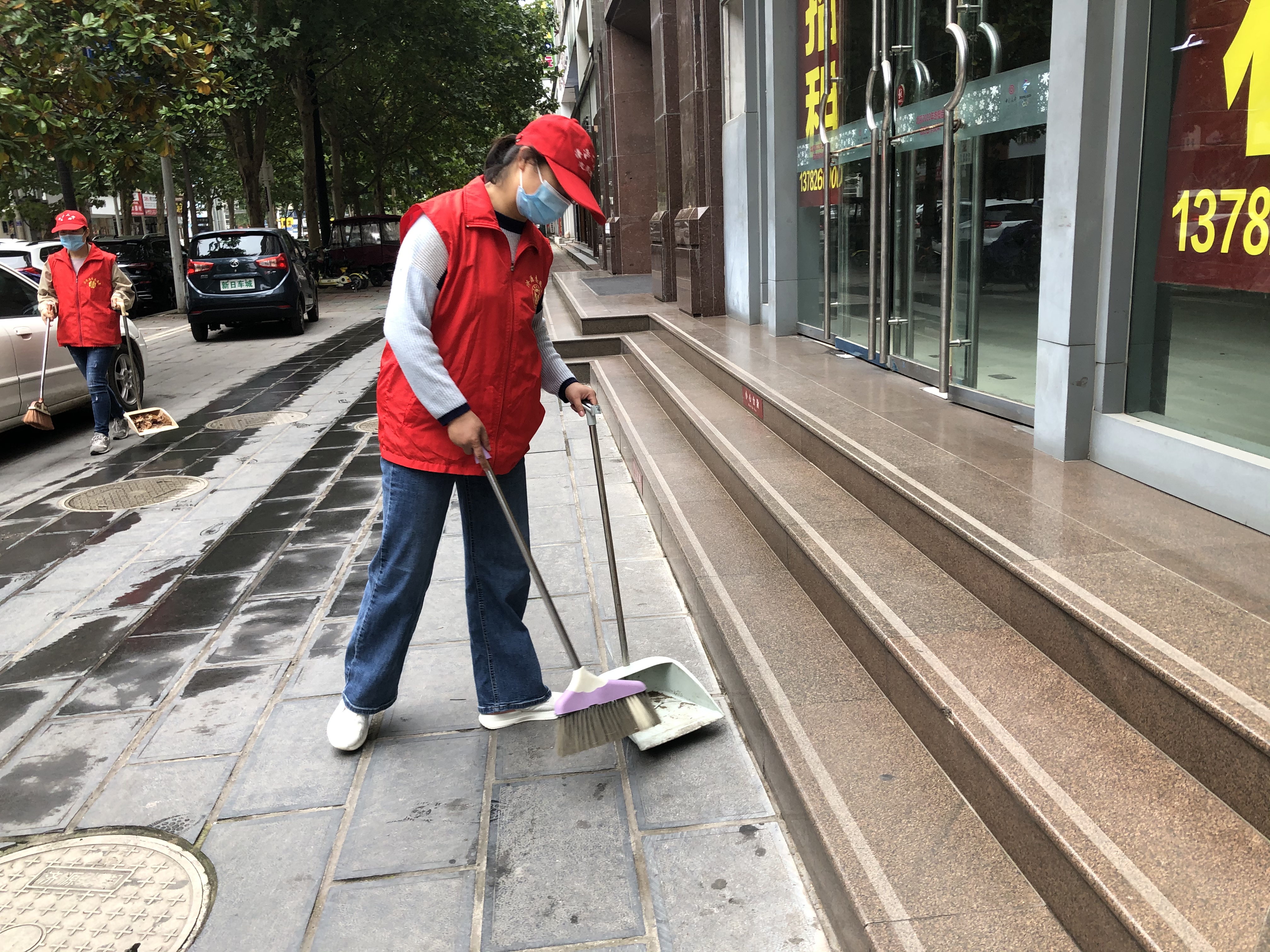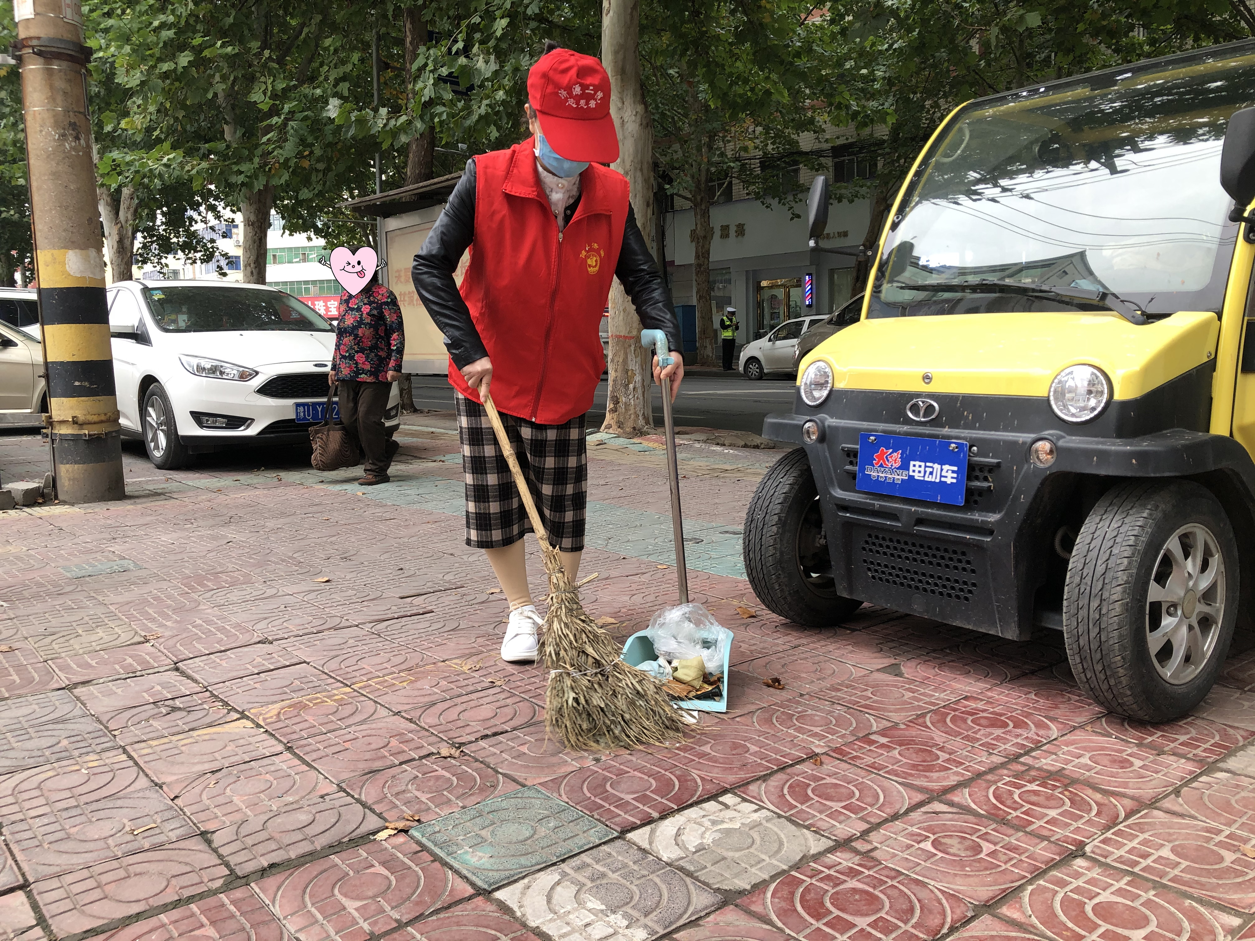 在汤帝路上,志愿者们身穿红马甲,头戴小红帽,一个个精神抖擞,迅速投入到志愿者服务中去。志愿者有的手持扫帚,有的手拿小簸箕,将路边的垃圾、烟头、矿泉水瓶等杂物一一捡起,顿时地面上干净了许多。洒水清洁车在道路两旁来回清扫、散水,保持道路上干净整洁。