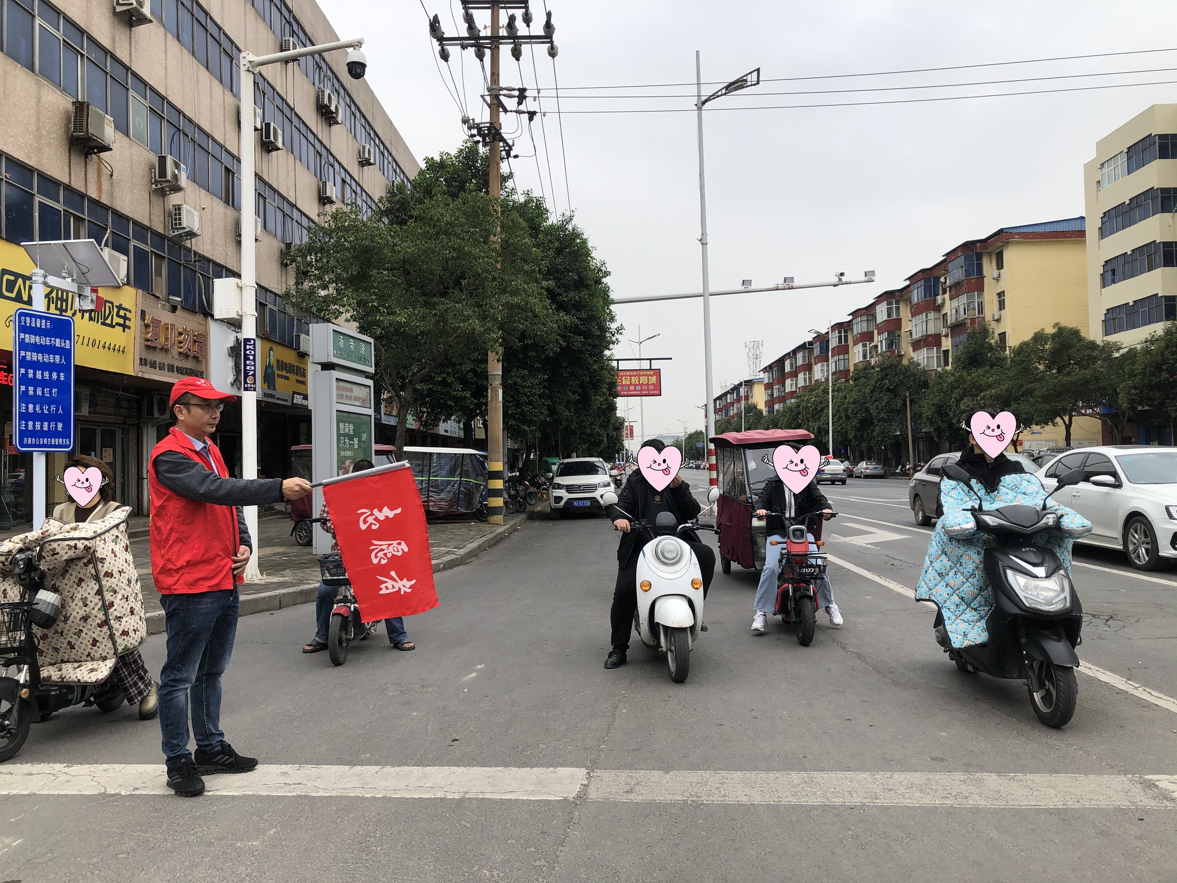 志愿者手拿引导旗,在十字路口倡导车让人、人守规,文明引导行人通过并对不文明行为进行劝导,劝导行人不闯红灯,遵守交通规则,提升驾驶员和行人的交通文明和绿色出行意识,以实际行动为城市增添文明色彩。